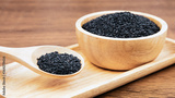 Black sesame seeds in a wooden spoon For healthy food and diet concepts.