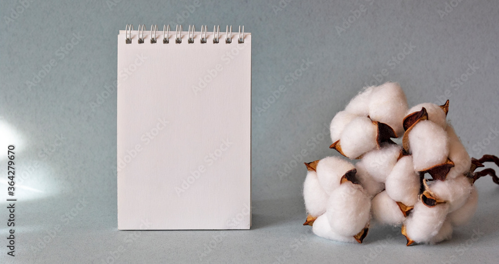 empty desk calendar with copy space for text, design and graphics, isolated on a blue background, next to cotton