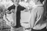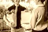 Food Delivery concept. Asian woman hand accepting bag of food, fruit, vegetable delivery from professional deliveryman Postman and express grocery delivery.