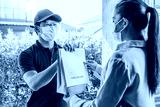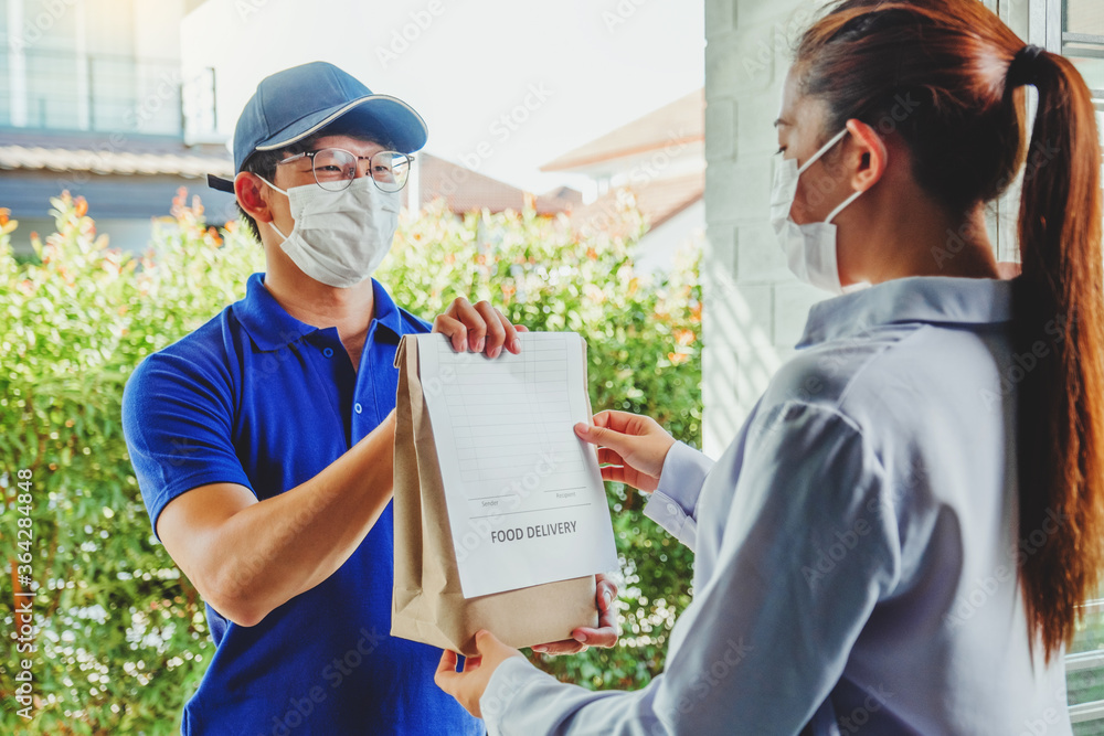 Asian delivery man wearing face mask hand giving bag of food delivery to female customer grocery delivery service during covid19.
