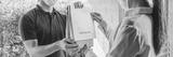 Asian delivery man wearing face mask hand giving bag of food delivery to female customer grocery delivery service during covid19.