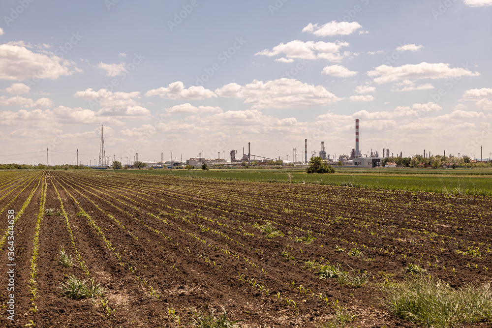 Young Corn Fields on a sunny day with blue sky and chemical plant in the background