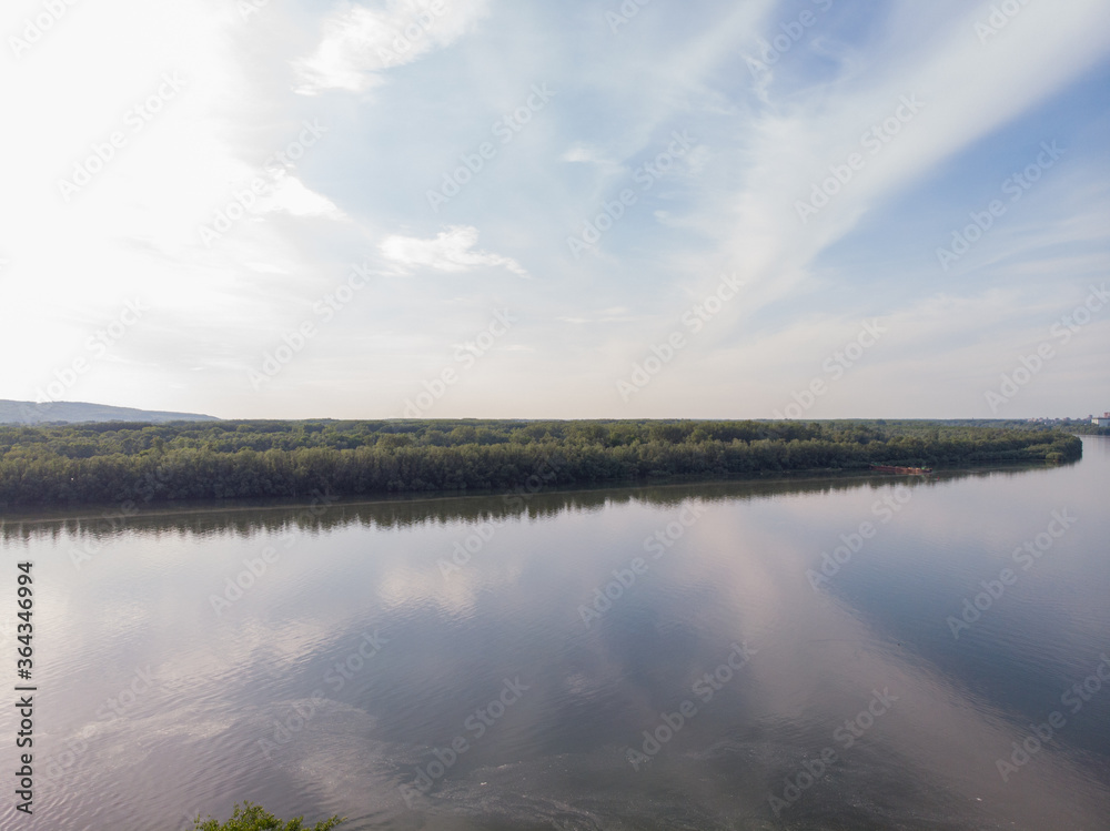Aerial Drone view of Danube river and blue sky. Beautiful amazing landscape image of Danube river.