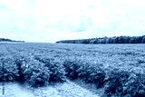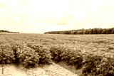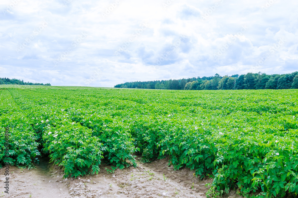 Potatoes are planted in rows on the field against the blue sky