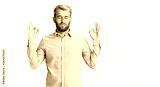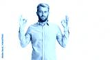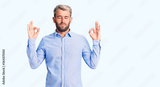 Young handsome blond man wearing elegant shirt relaxed and smiling with eyes closed doing meditation gesture with fingers. yoga concept.