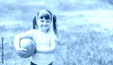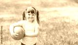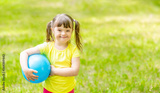 Smiling little girl with syndrome down holds ball in a summer park. Empty space for text