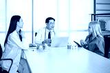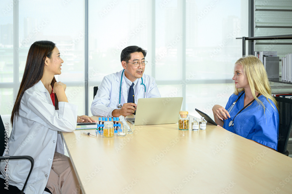 Group of doctors wearing formal white coat and blue scrubs suit, Teamwork brainstorm meeting with computer laptop at the hospital.