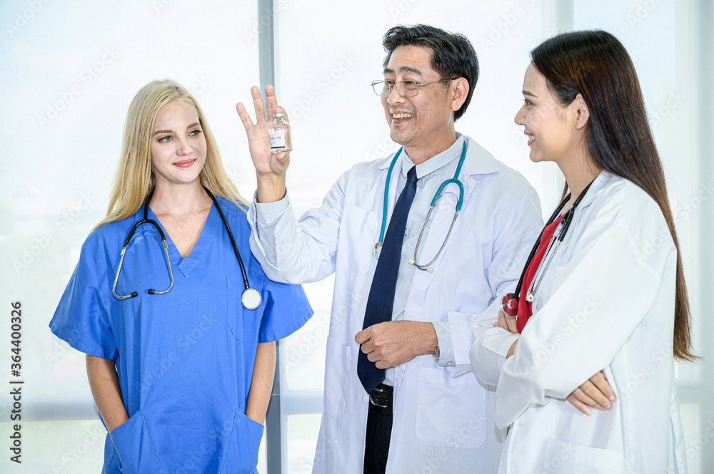 Group of doctors wearing formal white coat and blue scrubs suit, Teamwork brainstorm meeting at the hospital.