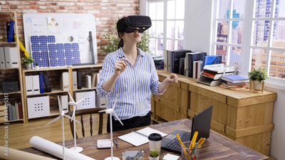 Professional asian korean female architect wearing augmented reality headset work with 3D green building. High tech office use virtual reality modeling software application. girl engineer in vr goggle