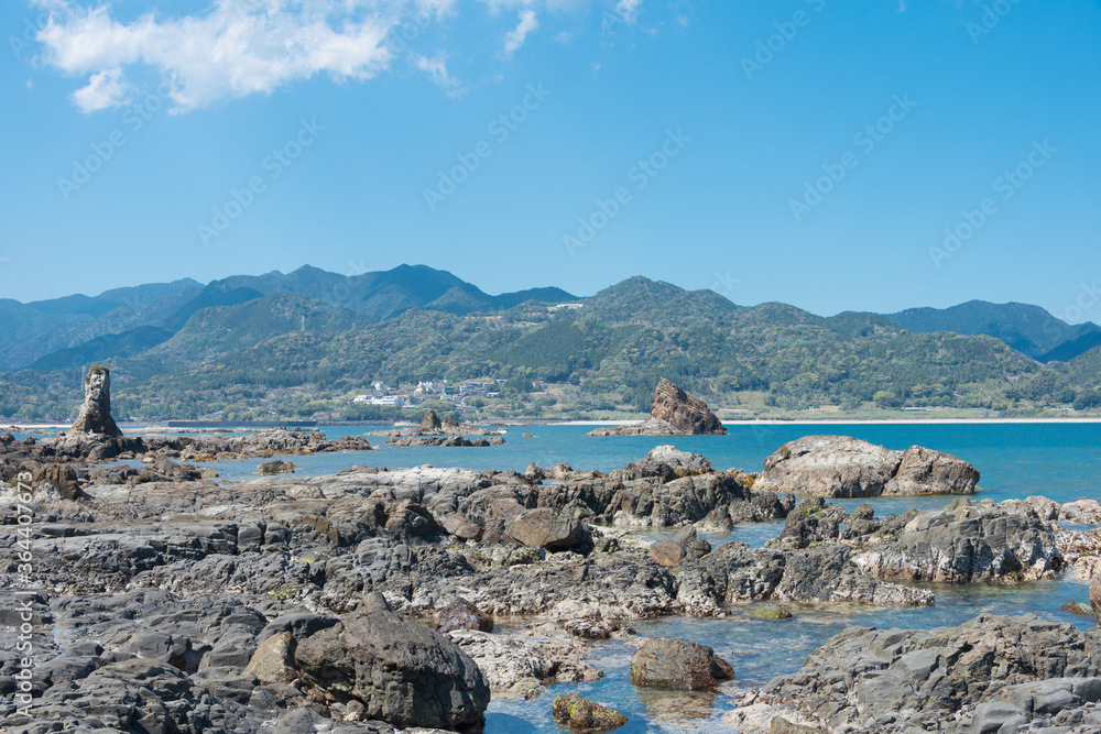 Ojaura Coast in Nachikatsuura, Wakayama, Japan. It is part of the Yoshino-Kumano National Park and Nanki Kumano Geopark.