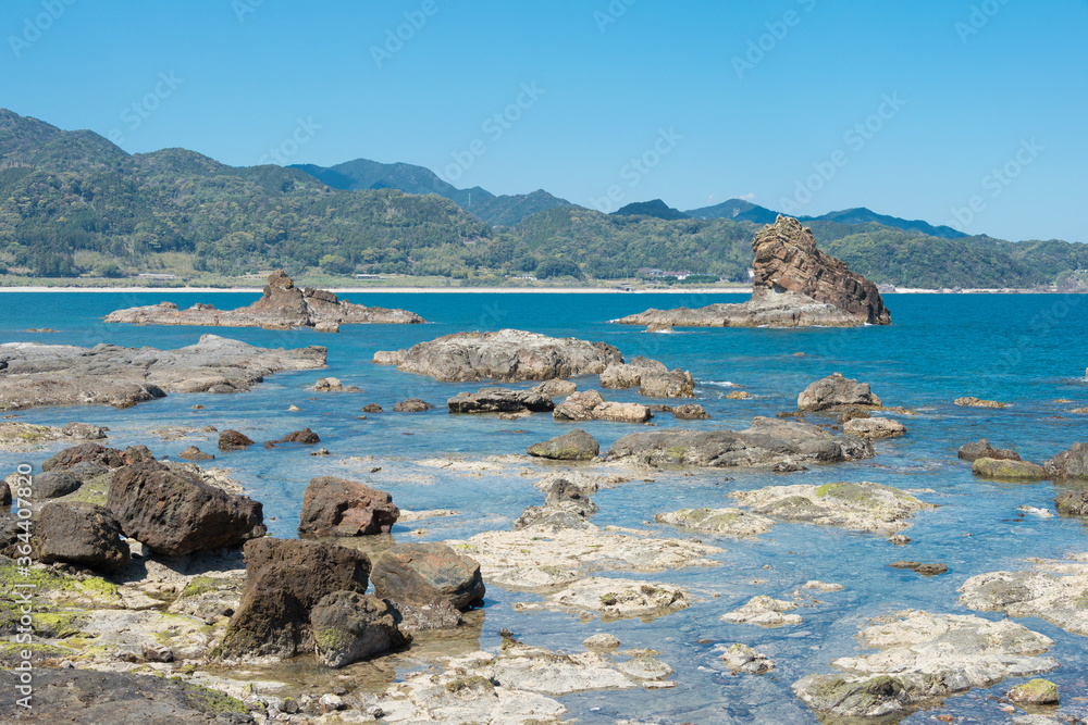 Ojaura Coast in Nachikatsuura, Wakayama, Japan. It is part of the Yoshino-Kumano National Park and Nanki Kumano Geopark.