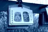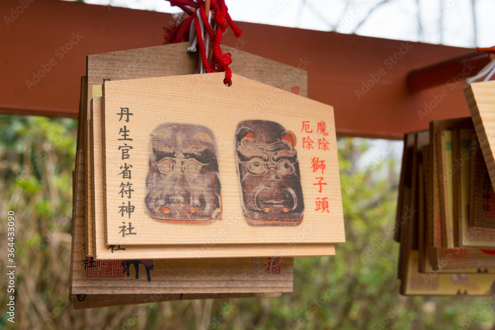 Traditional wooden prayer tablet (Ema) at Niukanshofu Shrine in Kudoyama, Wakayama, Japan.