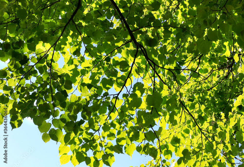 Tree branches with green fresh foliage glowing in the sunlight