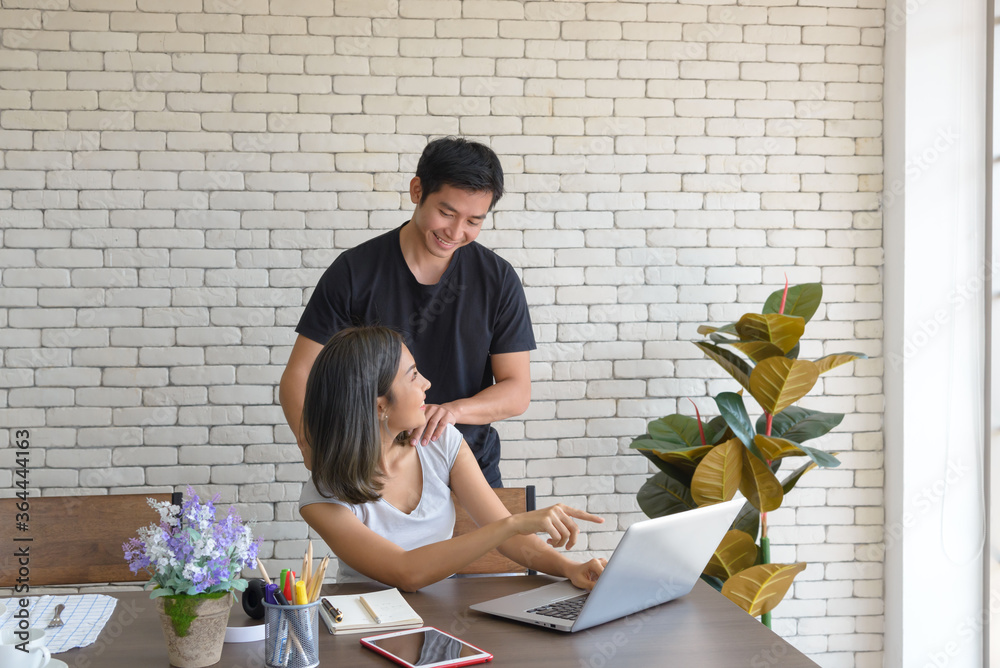 Young asian couple wear casual clothing relaxing while sitting at big wooden table in modern kitchen and working with computer laptop at home. Love, happiness, work at home concept
