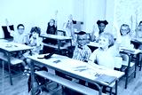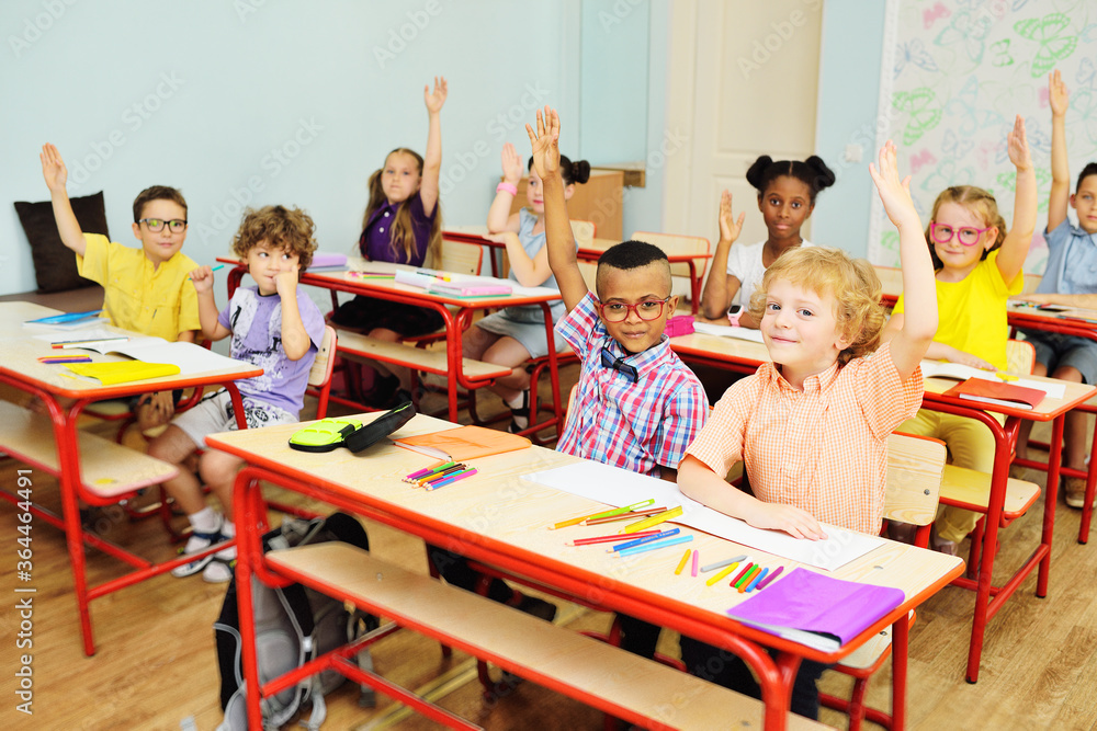 Small children school children smile and hold their hand up for a response against the background of a female teacher and a school class.
