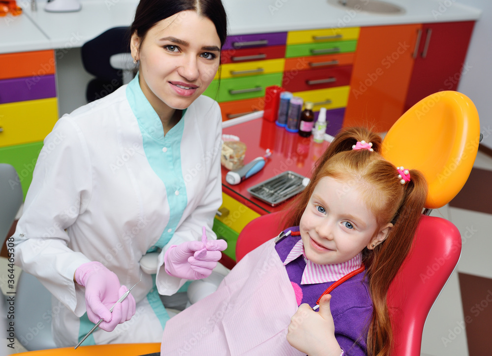 children's dentist examines the teeth and mouth of the child - a cute red-haired girl sitting in a dental chair