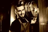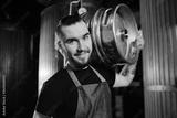 a young handsome male brewer holds an iron barrel with beer on the background of the brewery and beer tanks