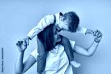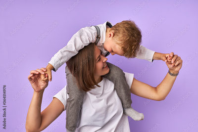 playful little caucasian boy hugs her mother neck and looks at her with a smile, parent and chil in love, happy