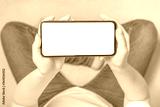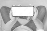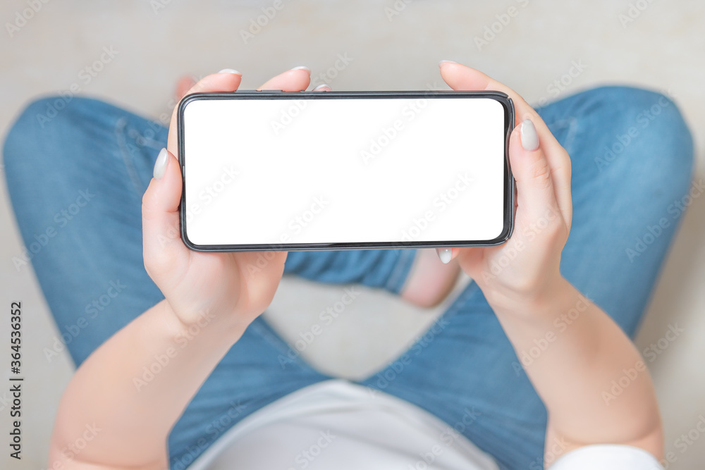 Mockup image blank white screen cell phone. female hands holding texting using mobile phone on sofa at home. cell phone in horizontal position. Empty space for advertise text.