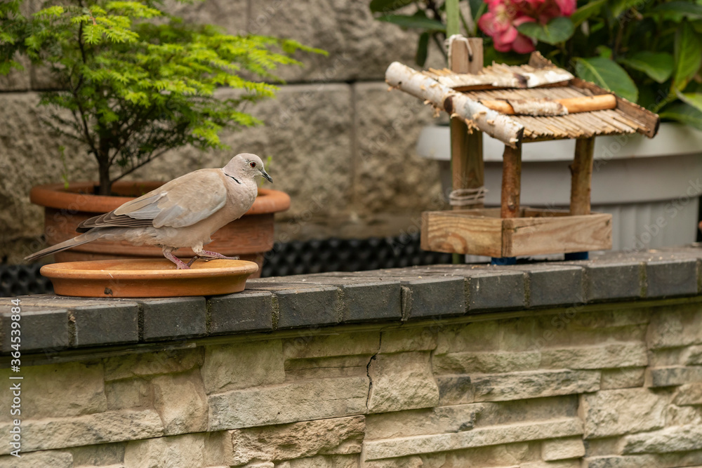 A collared dove using a drinking bowl for birds in a garden. Next to it is a feeder for small birds. Feeding animals, birdbath in summer