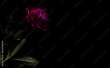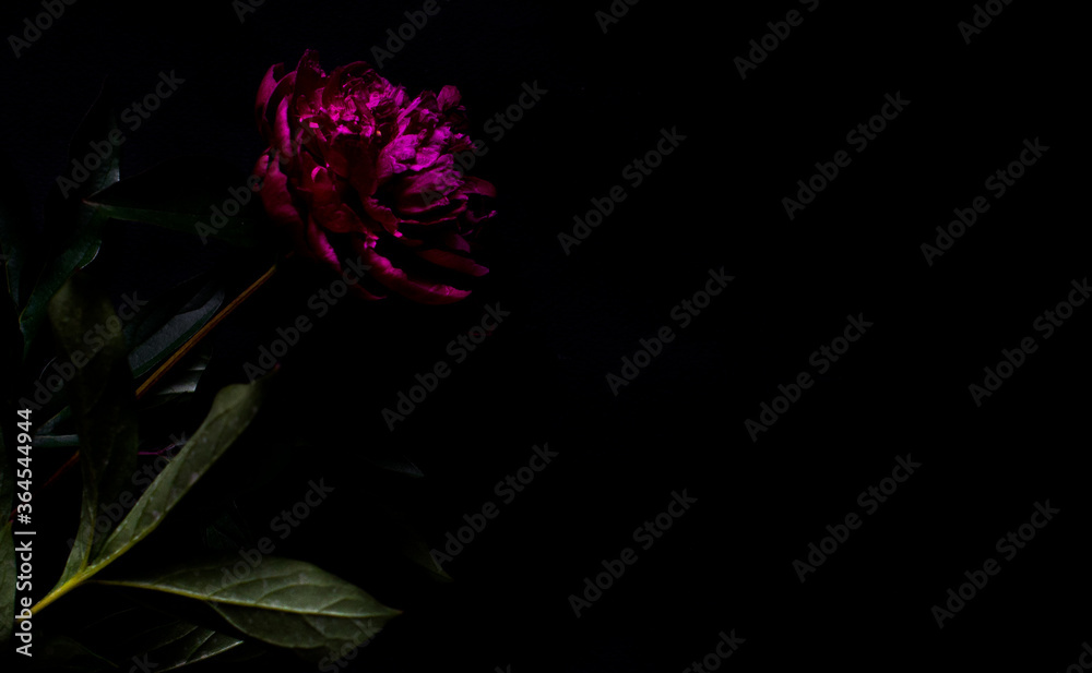 Pink peony, dark background. Fresh flowers with water drops. Wet pink peony flower macro isolated on black. Pink peony isolated on the black background. Close up on pink peony on dark background.