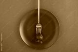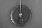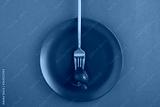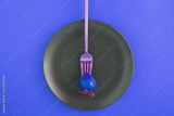 One blue strawberry impaled on a gold fork in the black plate on the blue background. Top view.