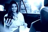 Smart business woman using phone and working on her laptop at the back sit of a car.