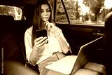 Smart business woman using phone and working on her laptop at the back sit of a car.