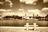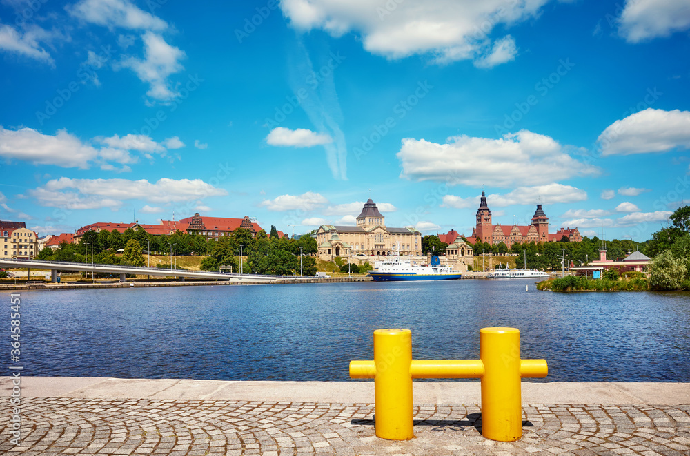 Szczecin waterfront with yellow mooring bollard in foreground, Poland.