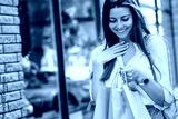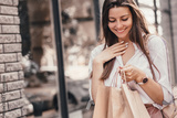 Beautiful smiling woman with shopping bags walking near mall on the street.