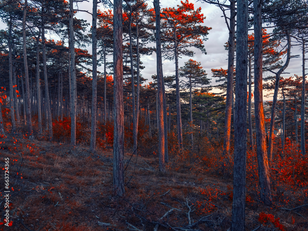 The Pasta and Pizza sign on old intentionally blurred house with balcony and plants in pots.