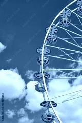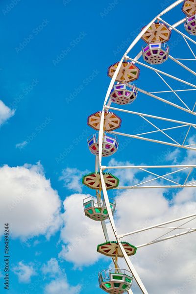 Ferris wheel on a sunny day with blue sky and clouds in background.