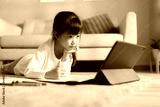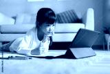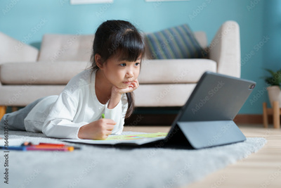 homeschooling. Asian little girl doing drawing with online teacher on tablet digital