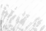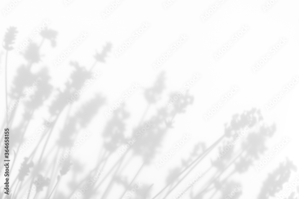 Blurred overlay effect for for natural light photo effects. Gray shadows of lavender flowers on a white wall. Abstract neutral nature concept background. Space for text.