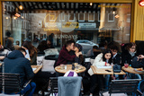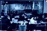 Guy and a girl are hugging at a table in a outdoor cafe.