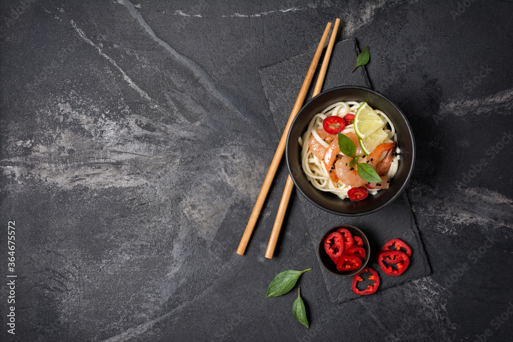 A traditional dish of Asian cuisine. Udon noodles with shrimps, red pepper and chopsticks