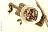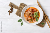 Tasty seafood. Shrimps in spicy asian sauce with chopstick
