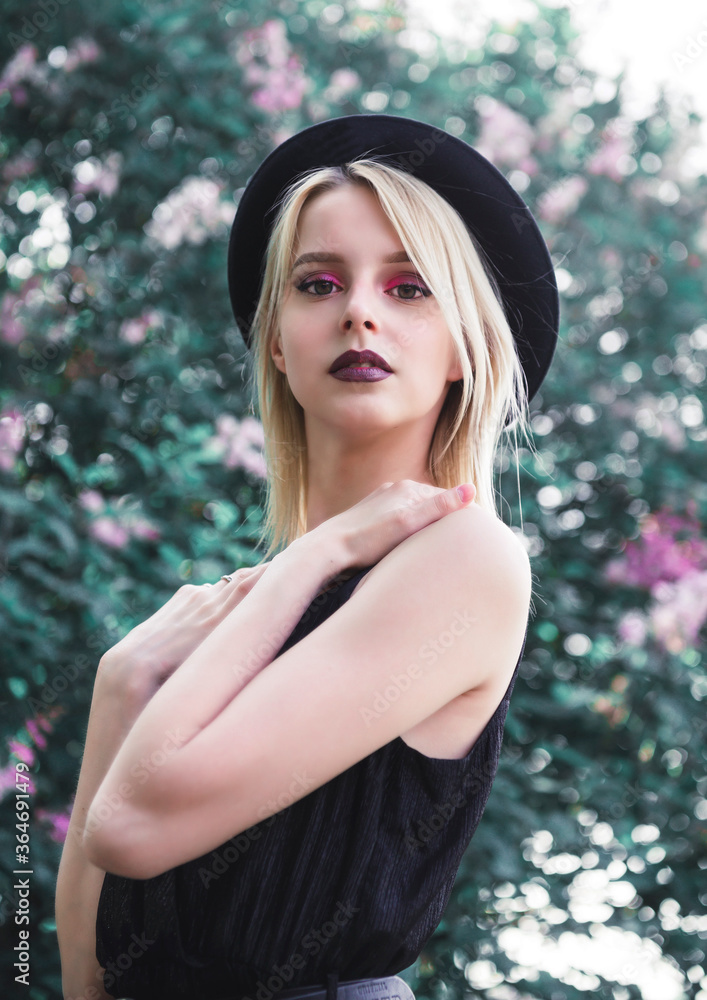 young blonde woman with pink makeup in a black top and hat against a background of blooming lilac