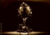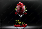 Full wine glass of ripe cherries on a black background. Natural product. Natural color. Close-up.