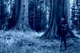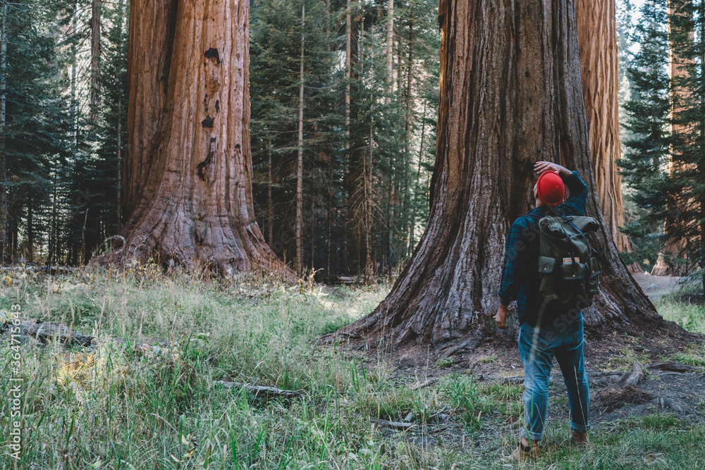 Back view of guy wanderlust looking up at high sequoia exploring nature of redwood during trip to America,young male traveler with touristic backpack admire giant trees in forest of national park.