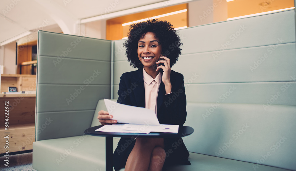 Portrait of female entrepreneur in stylish wear sitting with plank documentation satisfied with career, cheerful businesswoman looking at camera holding papers during positive smartphone talking