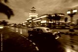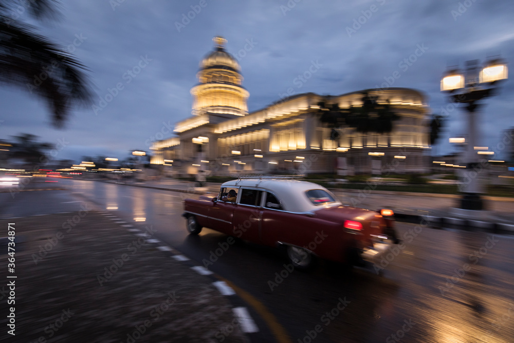 Old car on streets of Havana with Capitolio building in background with reflection on rain time. Cuba
