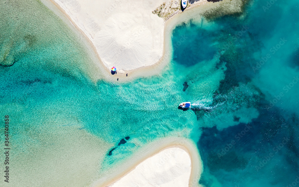 Aerial photo of white beach and blue sea lagoon with motor boat. Halkidiki peninsula, Greece. Summer background.