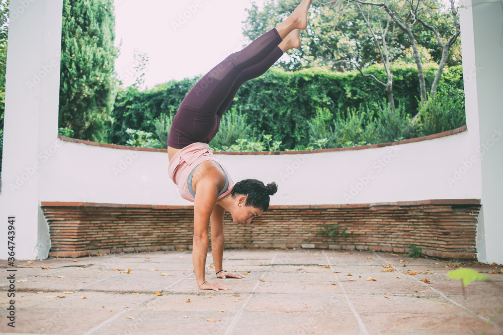 Young strong athletic female standing on hands enjoying inverse asanas during morning practice, calm spanish 20s woman in active wear breathing and reaching body relaxation during yoga training