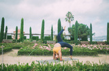 Strong spanish female in active wear standing in asana enjoying body flexibility and mental inspiration, young woman 20s having yoga practice in morning in park reaching relaxation and zen