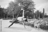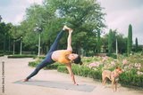Young strong spanish woman with athletic flexible body recreating on yoga training outdoors in park, calm tranquil female 20s in asana recreating and reaching vitality for physical strength and relax