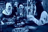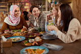 Lunch. Women Eating Food In Cafe. Group Of Multi-Ethnic Girls Having Breakfast And Talking. Friends Meeting In Restaurant As Part Of Urban Lifestyle.
