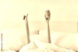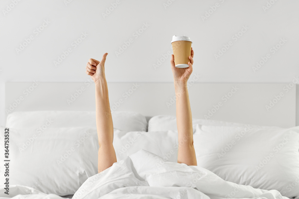 morning, comfort and people concept - young woman with cup of takeaway coffee lying in bed and showing thumbs up at home bedroom