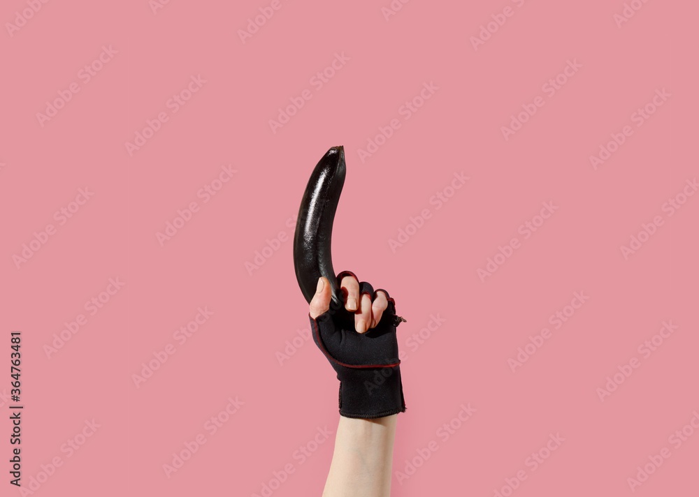 Hands holding a painted black banana on a pastel background. Concept for sex shops, adult toys