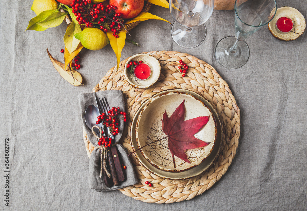 Autumn fall thankisgiving day table setting with pumpkins, fruits and yellow leaves, autumn decoration.